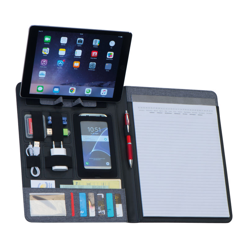 A4 konferencia mappa, ami tartalmaz tolltartó hurkot, 7 rekeszt, 4 elasztikus pántot, mobiltartót, tablettartót és egy 60 oldalalas vonalas jegyzettömböt.