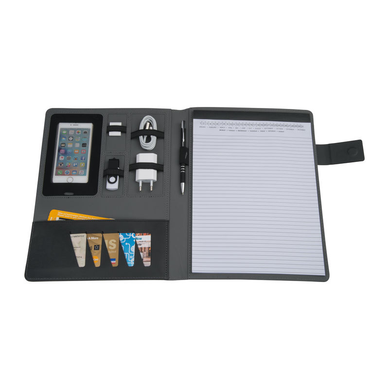 A4-es elegáns konferencia mappa különböző rekeszekkel, tolltartó hurokkal, mobiltartóval, 6 rekesszel, öntapadós 40 oldalas jegyzettömbbel, mágneses zárral ellátva.