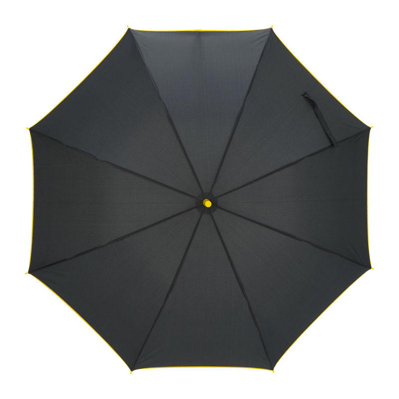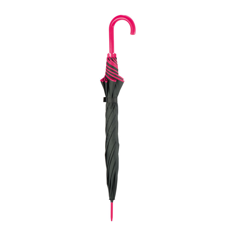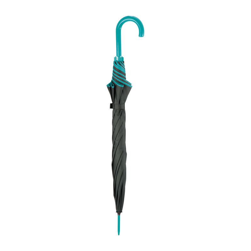 190T poliészterből készült esernyő, színes szegéllyel. Színezett műanyag markolattal, illetve azonos színű lakkozott nyéllel.