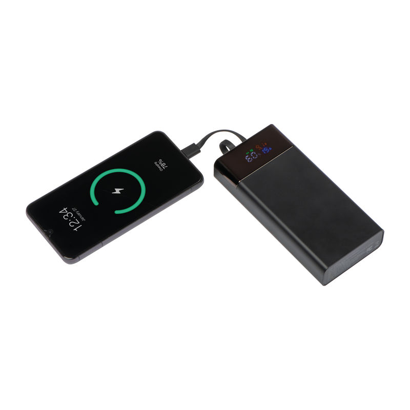 Biztosítsa mobiltelefonja töltöttségét power bankunkkal, amely lenyűgöző, 20000 mAh kapacitást kínál. Ez egy nagy teljesítményű külső akkumulátor gyorstöltő funkcióval, így eszközei pillanatok alatt újra használatra készek lesznek. Két USB-csatlakozóval, egy USB-C csatlakozóval és egy beépített iOS-kábellel sokféle töltési lehetőséget kínál minden eszköz számára. Az intelligens LCD töltőképernyő egy pillantással megmutatja az aktuális töltöttségi állapotot és más fontos információkat. Ez a Power bank ideális reklámajándék vagy praktikus kiegészítő a mindennapokra, amely funkcionalitásával és kiváló minőségű kidolgozásával igazán meggyőző. Exkluzív csomagolásban, 2 év garanciával.