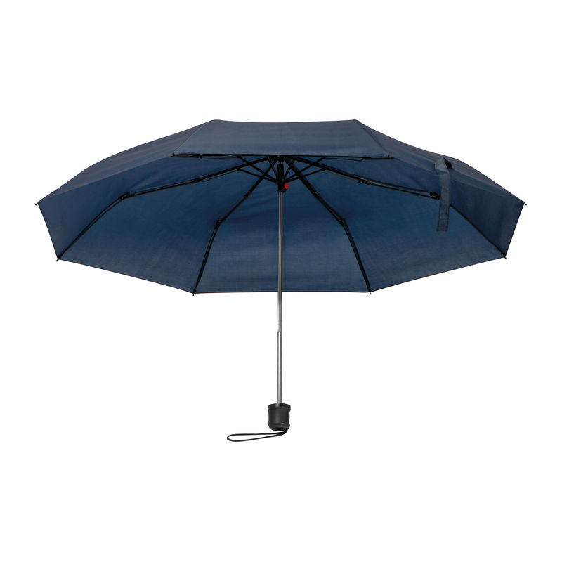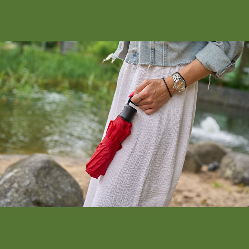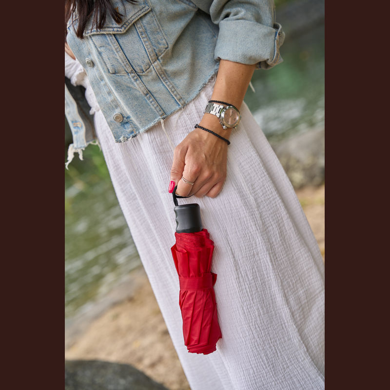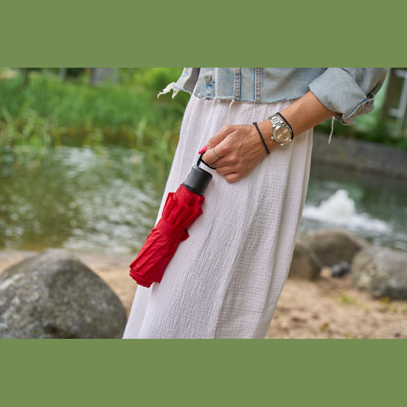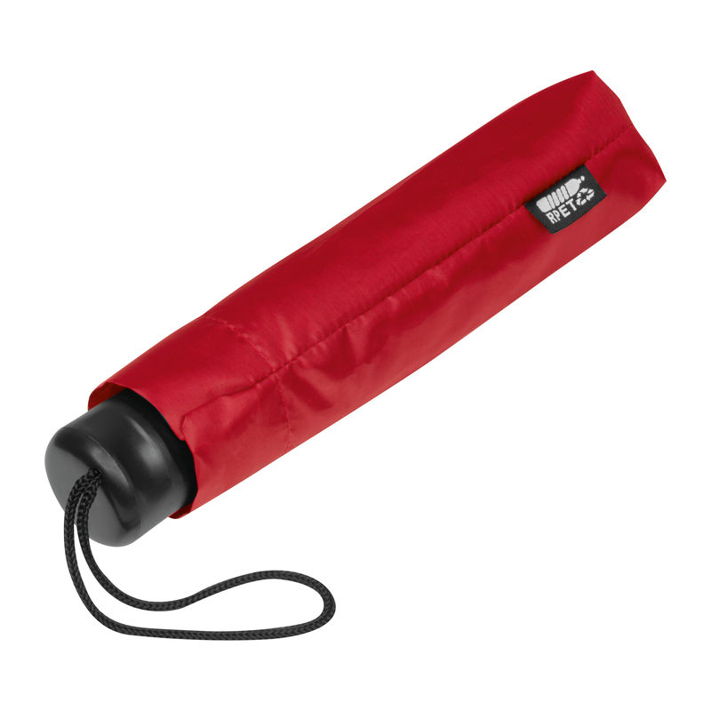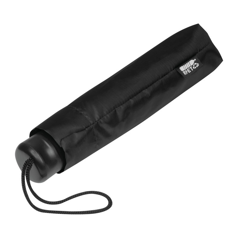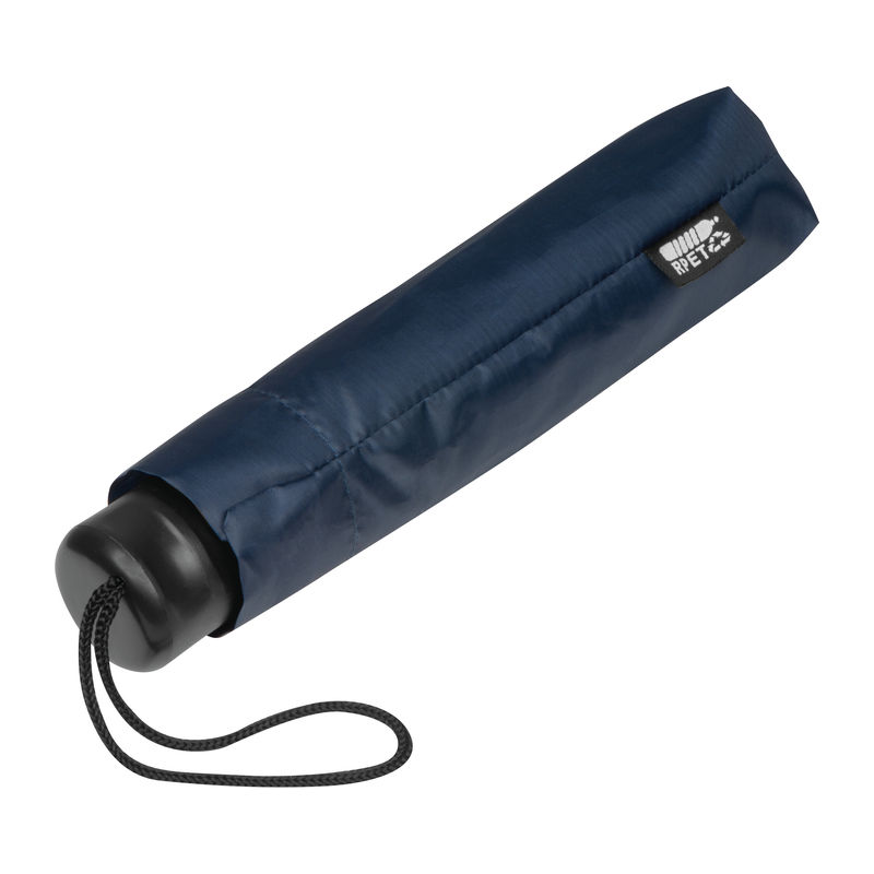 Kézi nyitású, teleszkópos, kis méretű esernyő újrahasznosított PET-ből, védőtokkal.