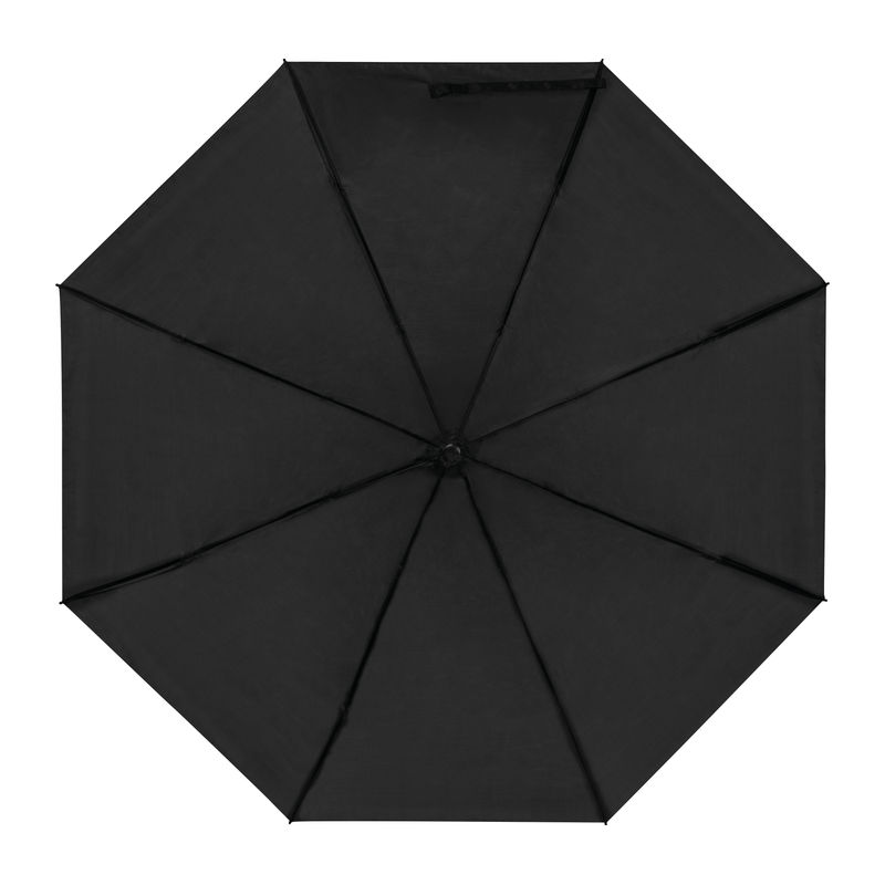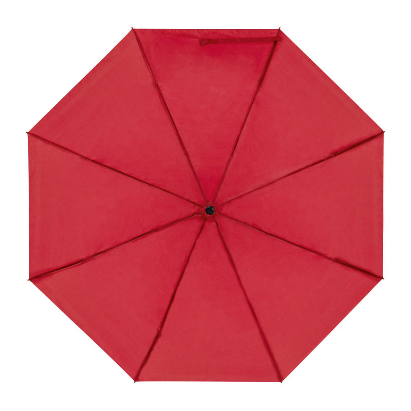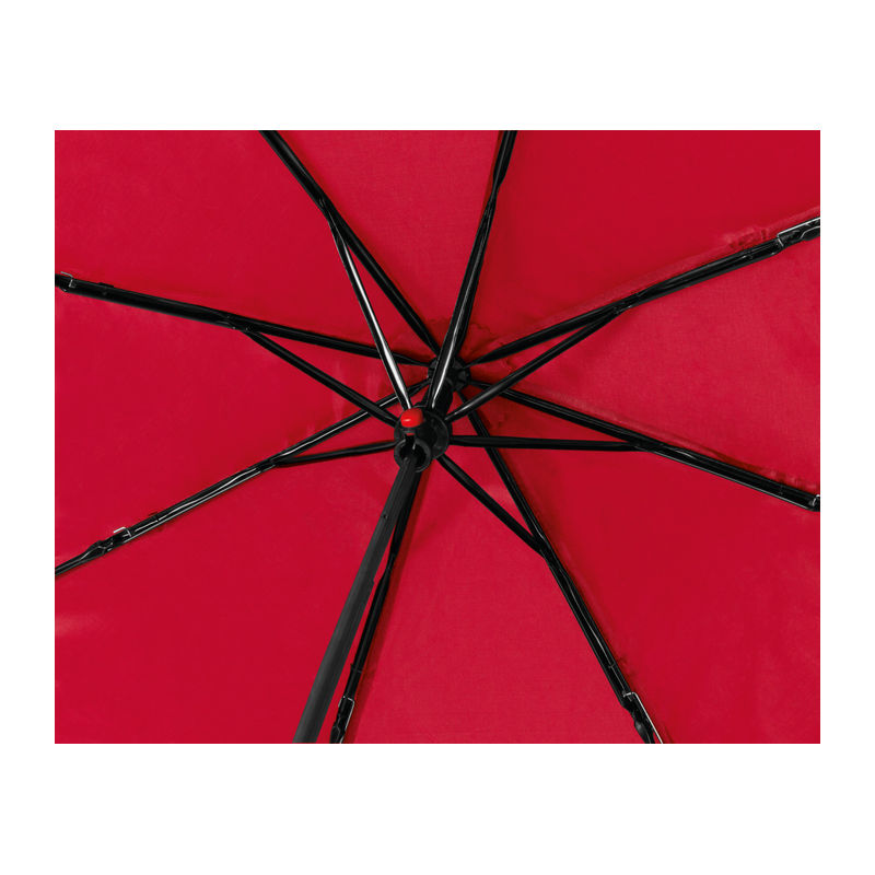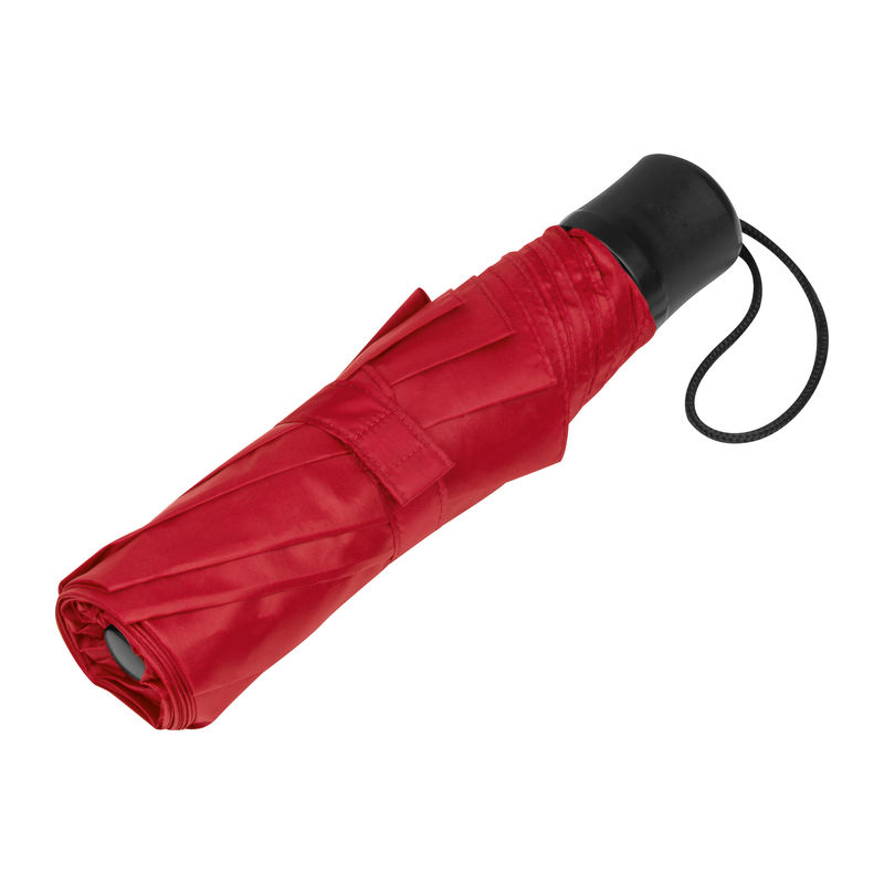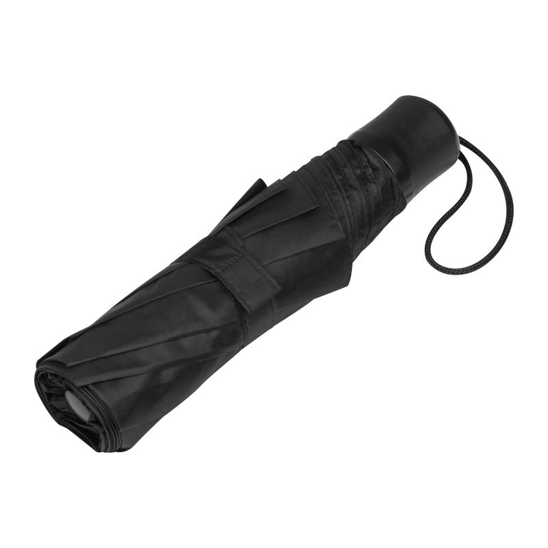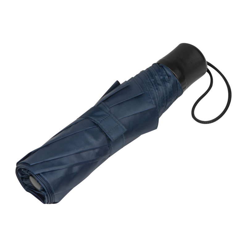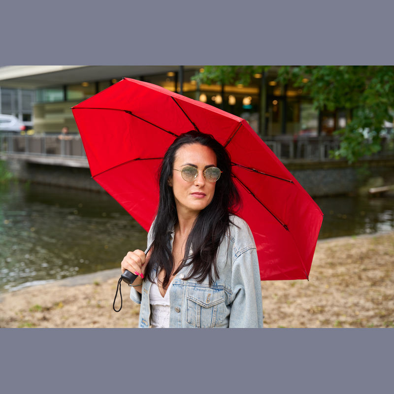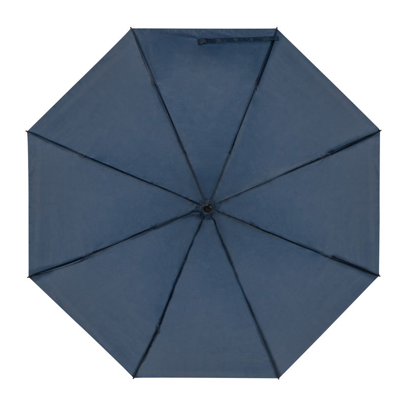 Kézi nyitású, teleszkópos, kis méretű esernyő újrahasznosított PET-ből, védőtokkal.