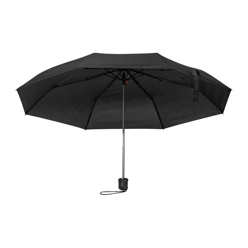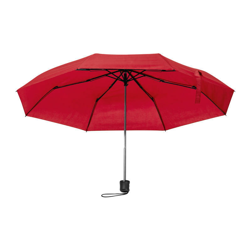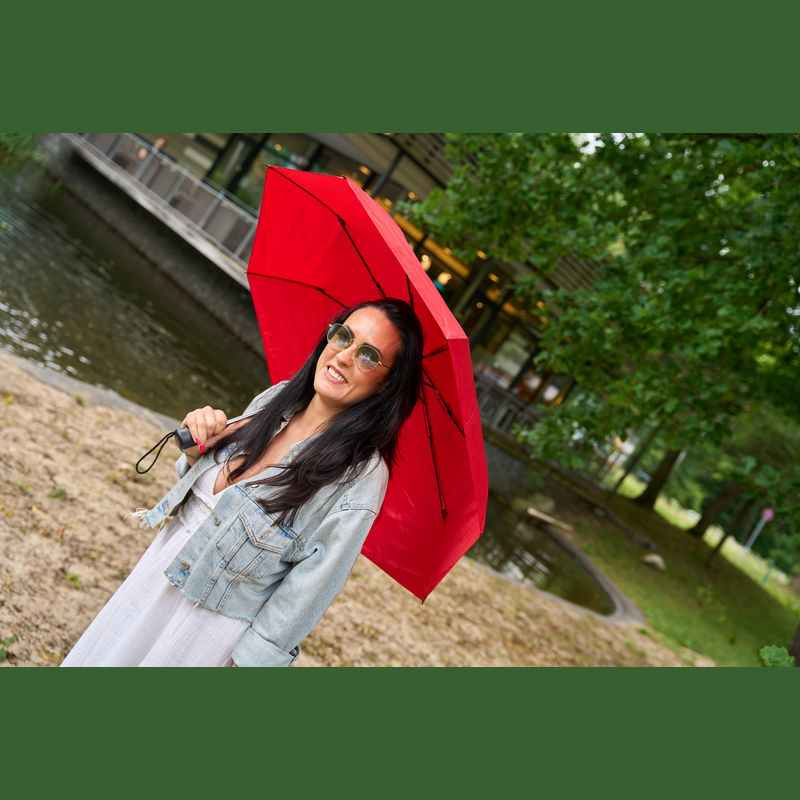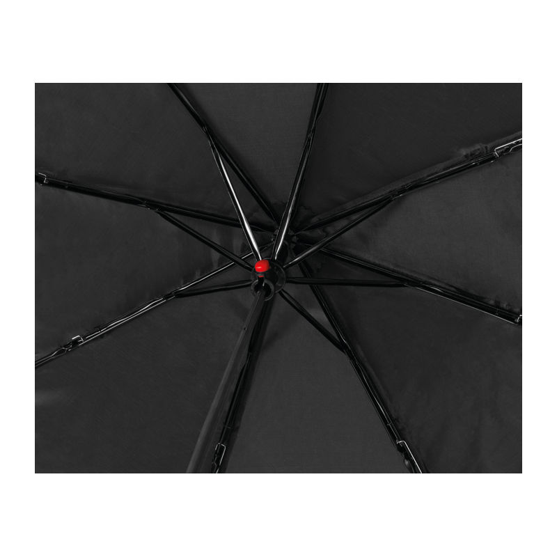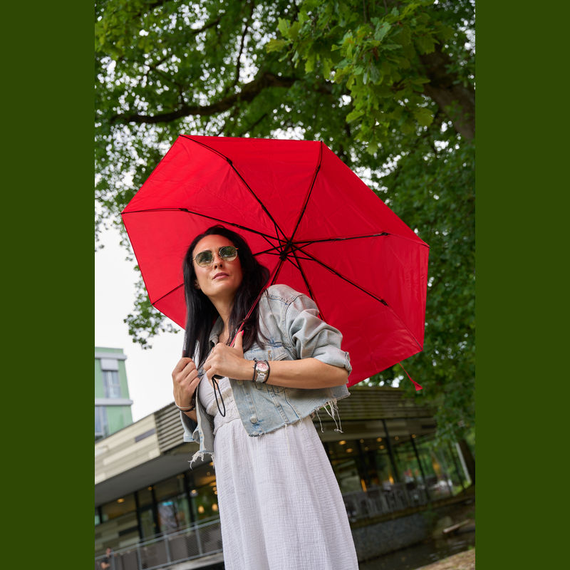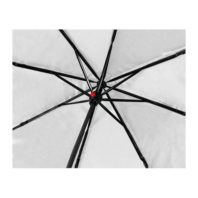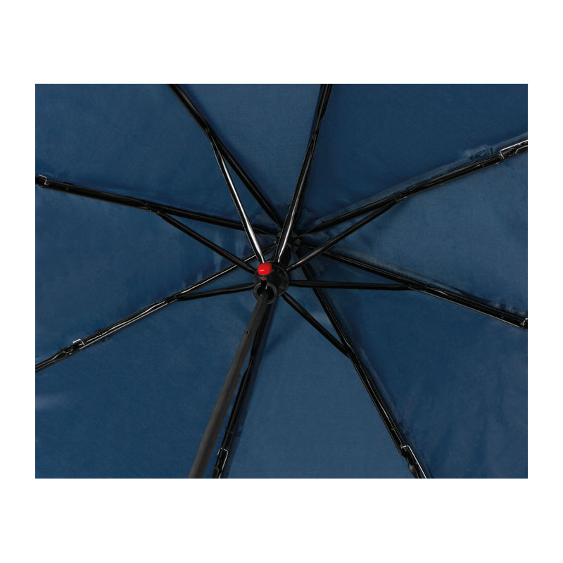 Kézi nyitású, teleszkópos, kis méretű esernyő újrahasznosított PET-ből, védőtokkal.