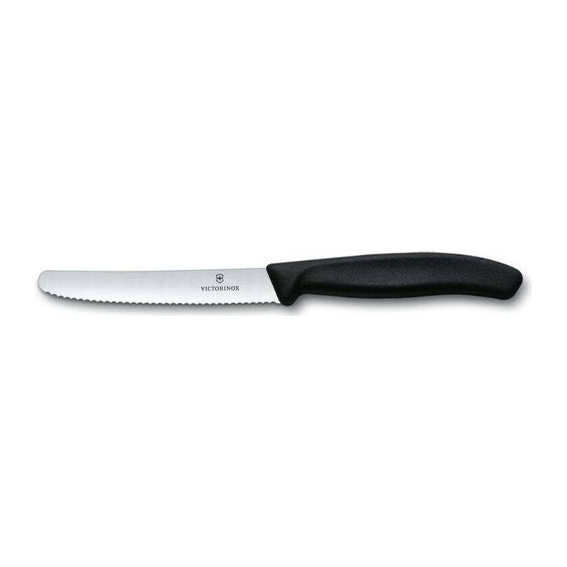 Svájci konyhai kés, nagyon éles recézett penge, kényelmes markolat, mosogatógépben mosható, penge hossza 11 cm, súly 33 g.