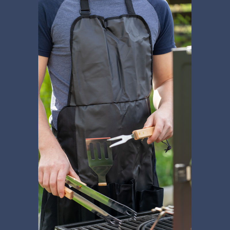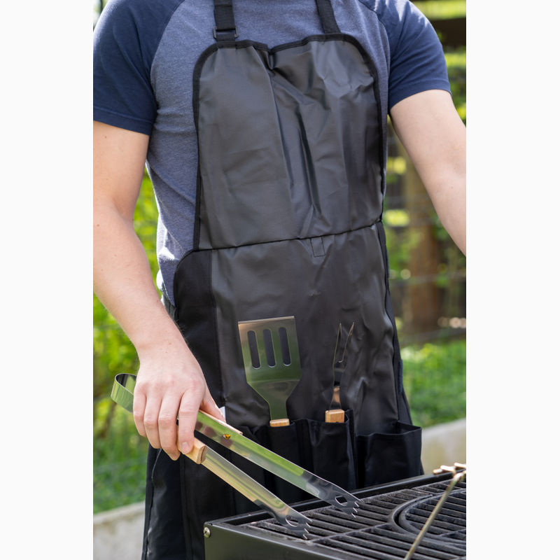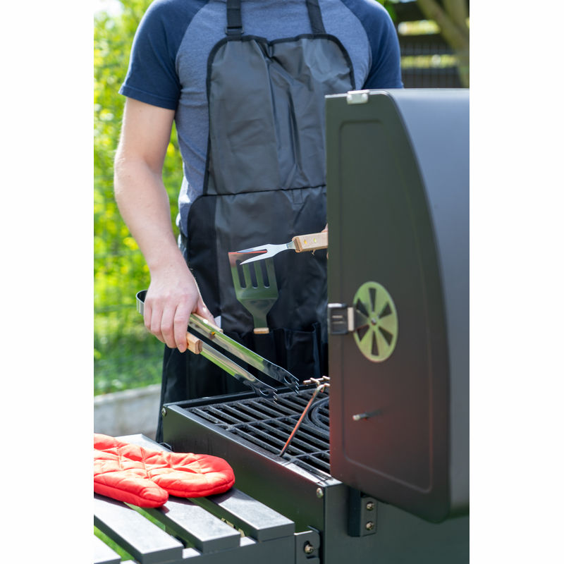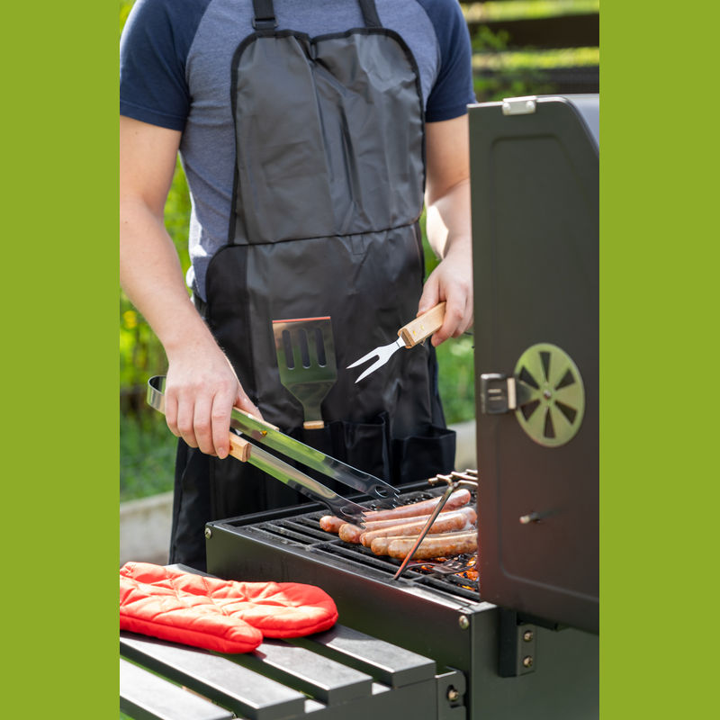 A grillező készlet roszdamentes acélből és tölgyfából készült és húsvillát, húslapátot, húscsipeszt és edényfogót tartalmaz. Tárolására és szállítására kialakított praktikus tartó,amely szétnyitva kötényként funkcionál.